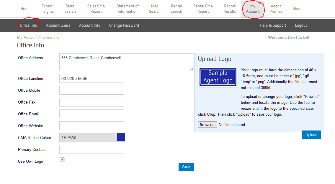 How do I add/change my logo on the iOS App? Your agency logo and default report colour are controlled from the office info section of your account on the desktop site. Log into your account here to manage this under Office Info