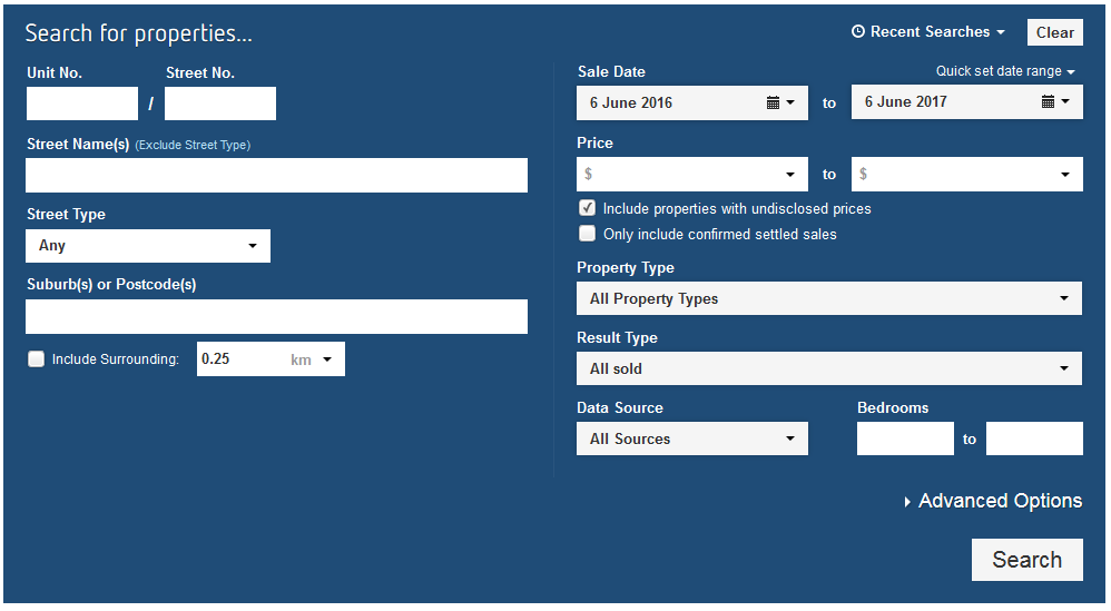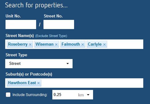 Note that you can also search for multiple streets or suburbs by typing them in the boxes. You do not provide a radius when searching multiple areas.