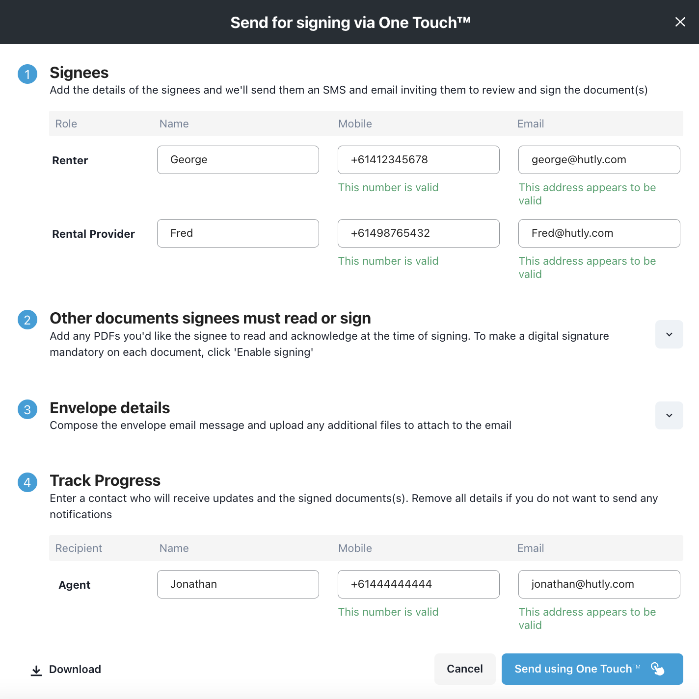 After an agreement has been finalised, you can send it for digital signing using Hutly One Touch™